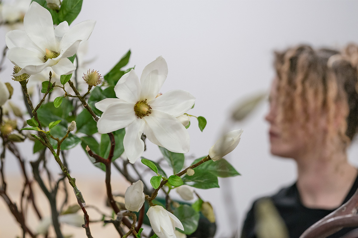 Three trees, magnolia blooms, and pampas grass installation.